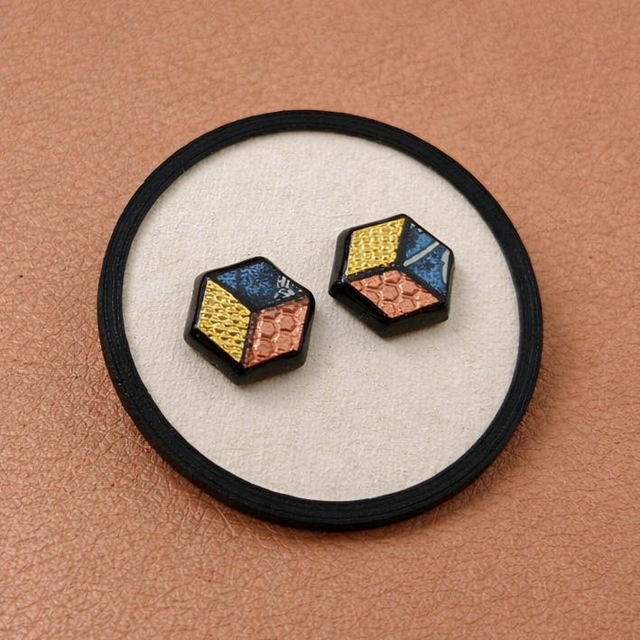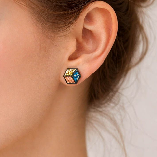 Leggeri e resistenti, con un’estetica grafica e contemporanea, questi orecchini a bottone sono pensati per creare un'illusione ottica tra la forma esagonole e il disegno grafico di un cubo a tre colori. Pensati per un uso quotidiano.